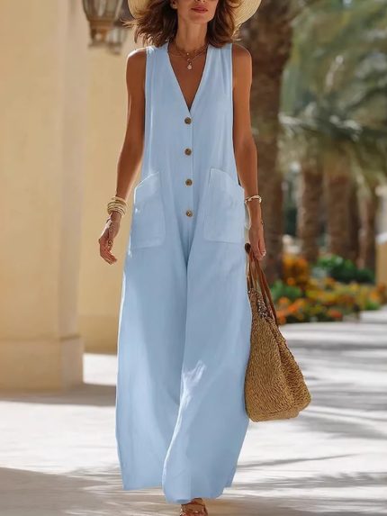 Women’S Summer Elegant Solid Color Jumpsuit Casual Loose Sleeveless Wide Leg Jumpsuit with Pockets