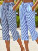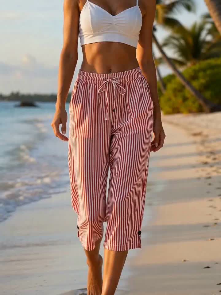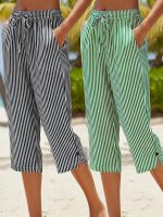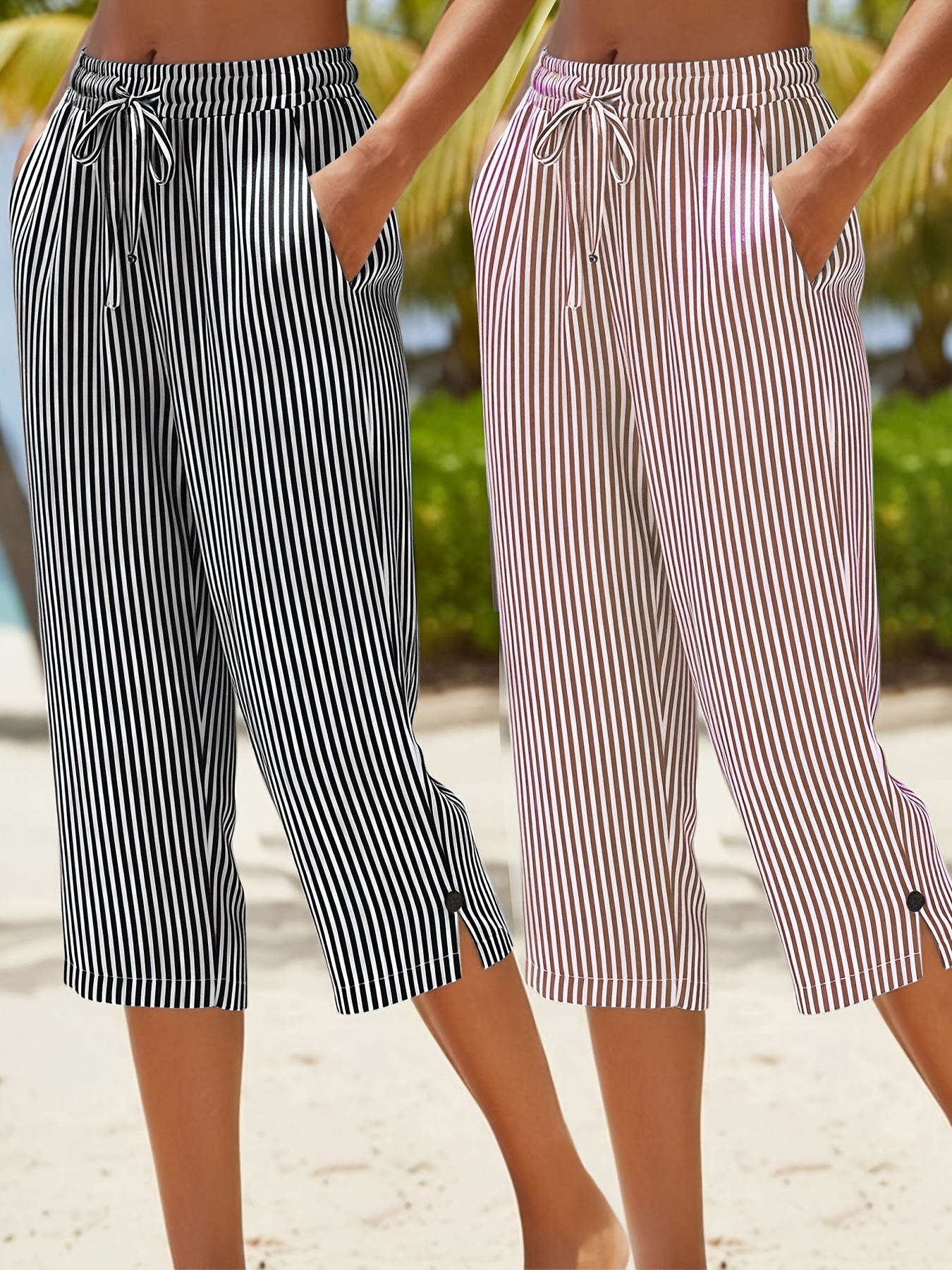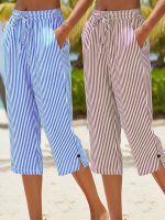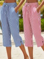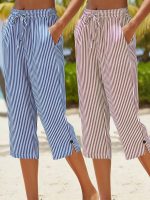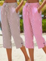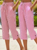 Women’s Casual – Striped Straight-Leg Pants – Lightweight Polyester, Machine Washable, with Pockets – Perfect for Springu002FSummer