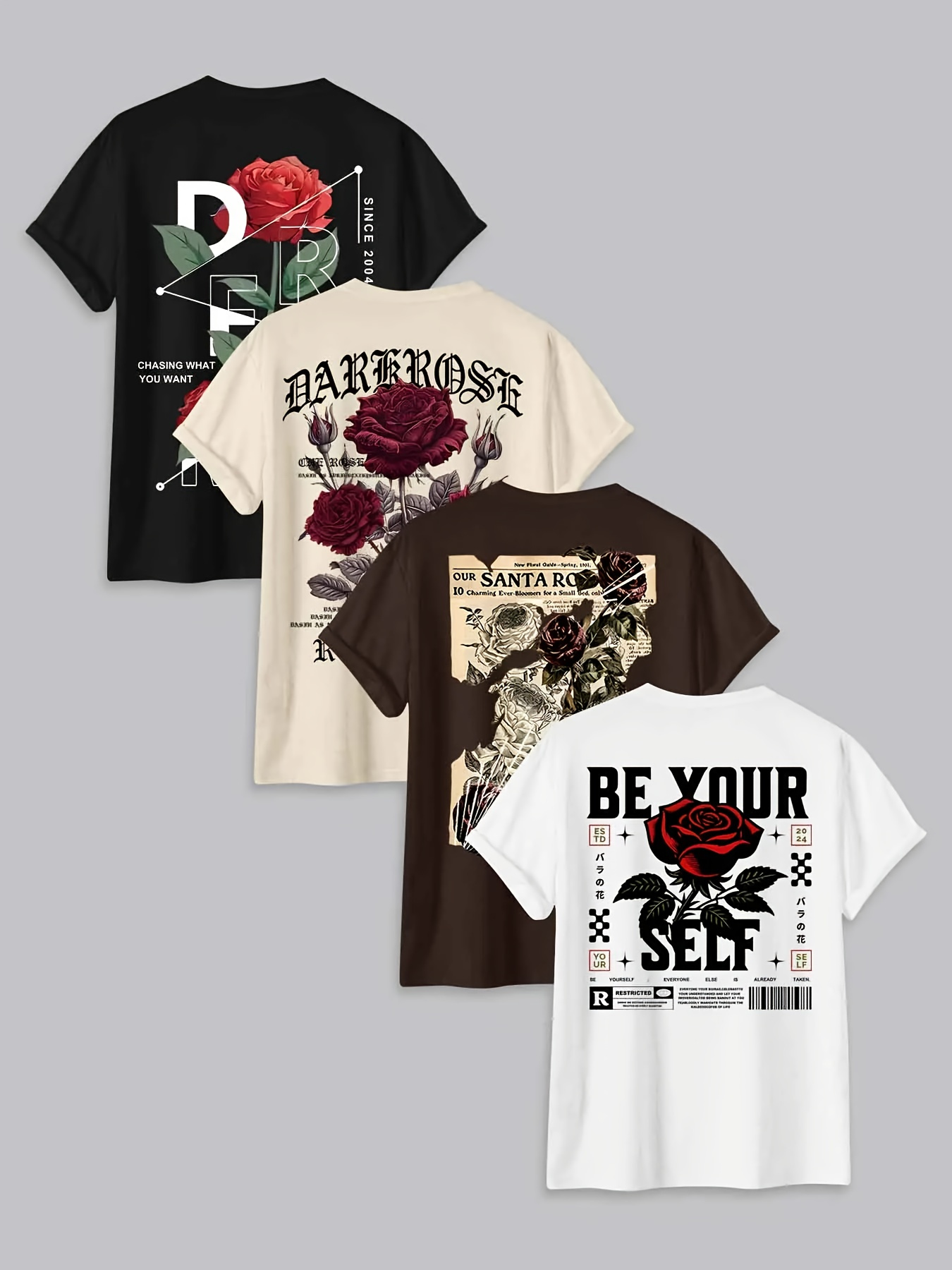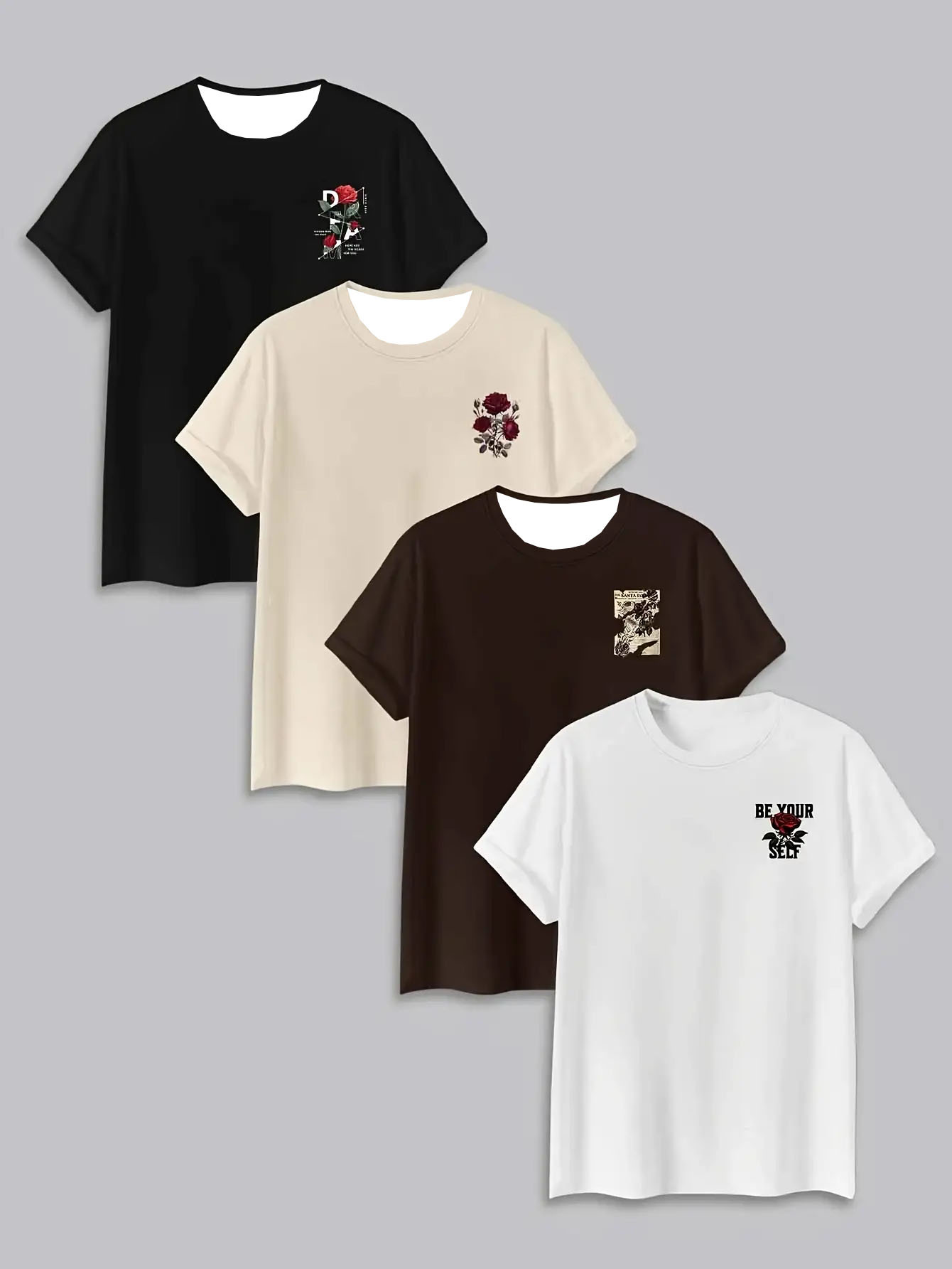 Home Men's T-Shirts 4pcs Set of Men’S Rose Print Casual Short Sleeve T-Shirts – Summer Round Neck Tops, Suitable for Daily Wear And Outdoor Activities, Casual Wear, Geometric Pattern, Durable Construction, Machine Washable, Multi-Pc Shirts, Printed Tops, Adult Men