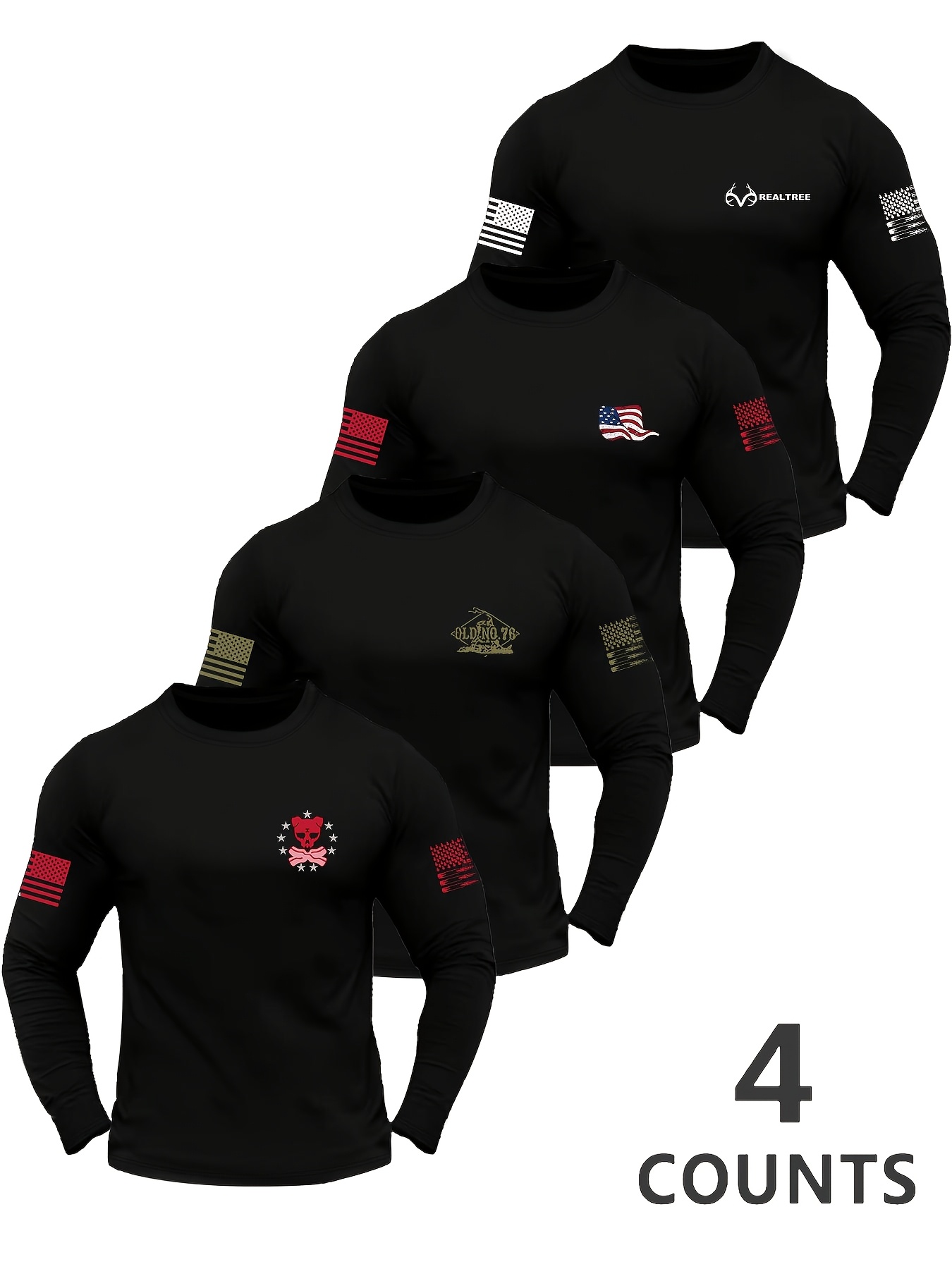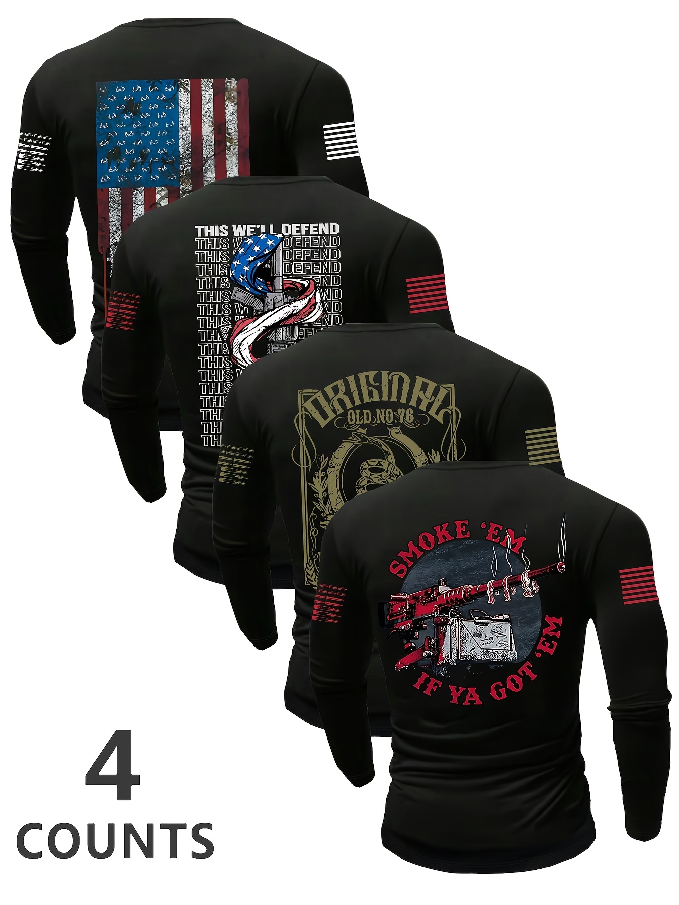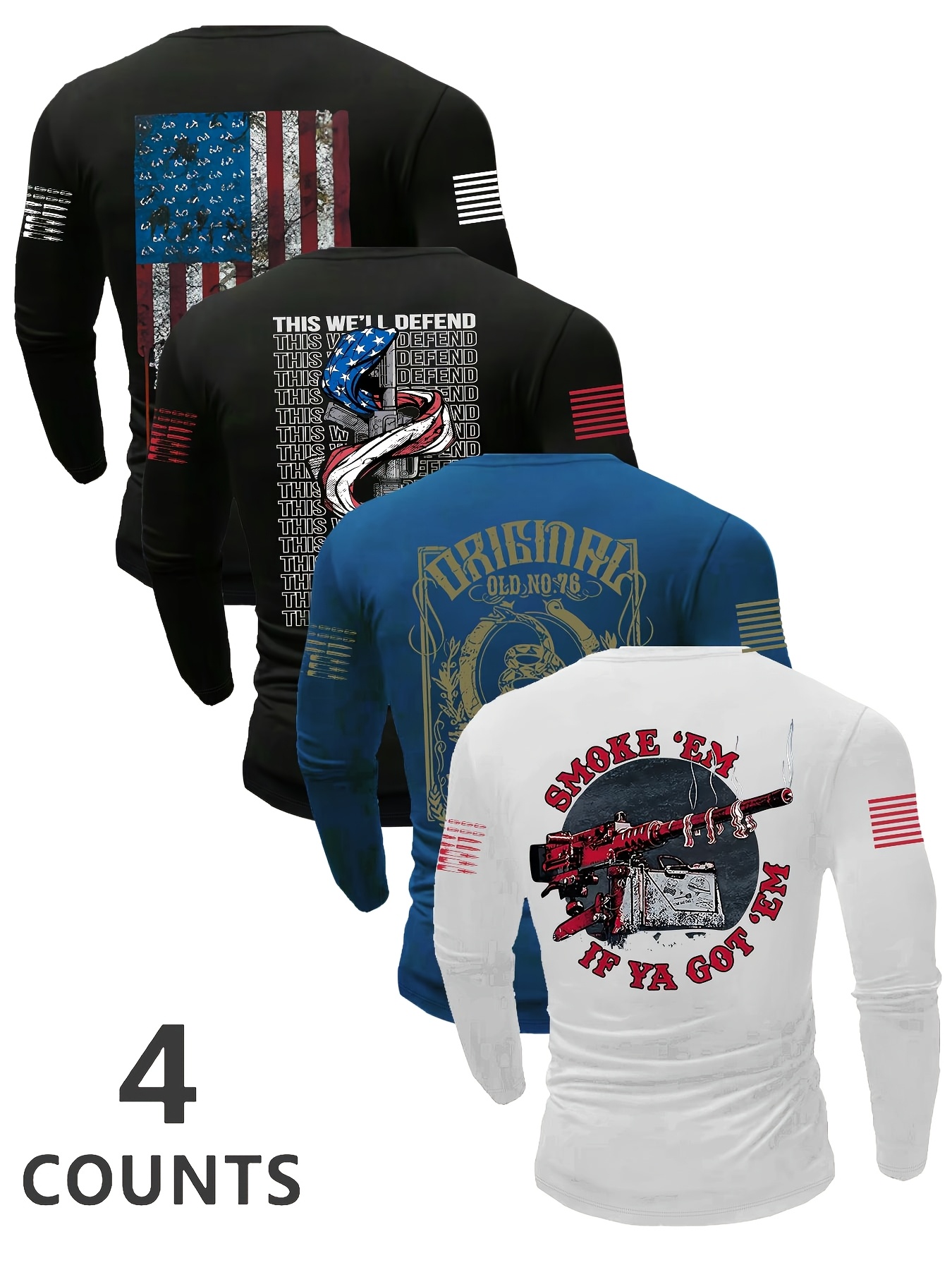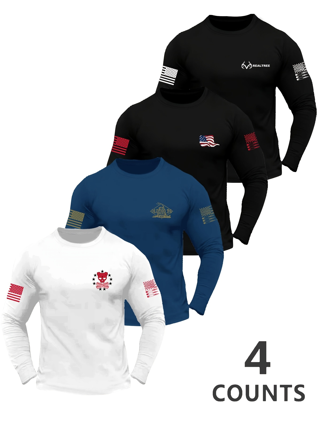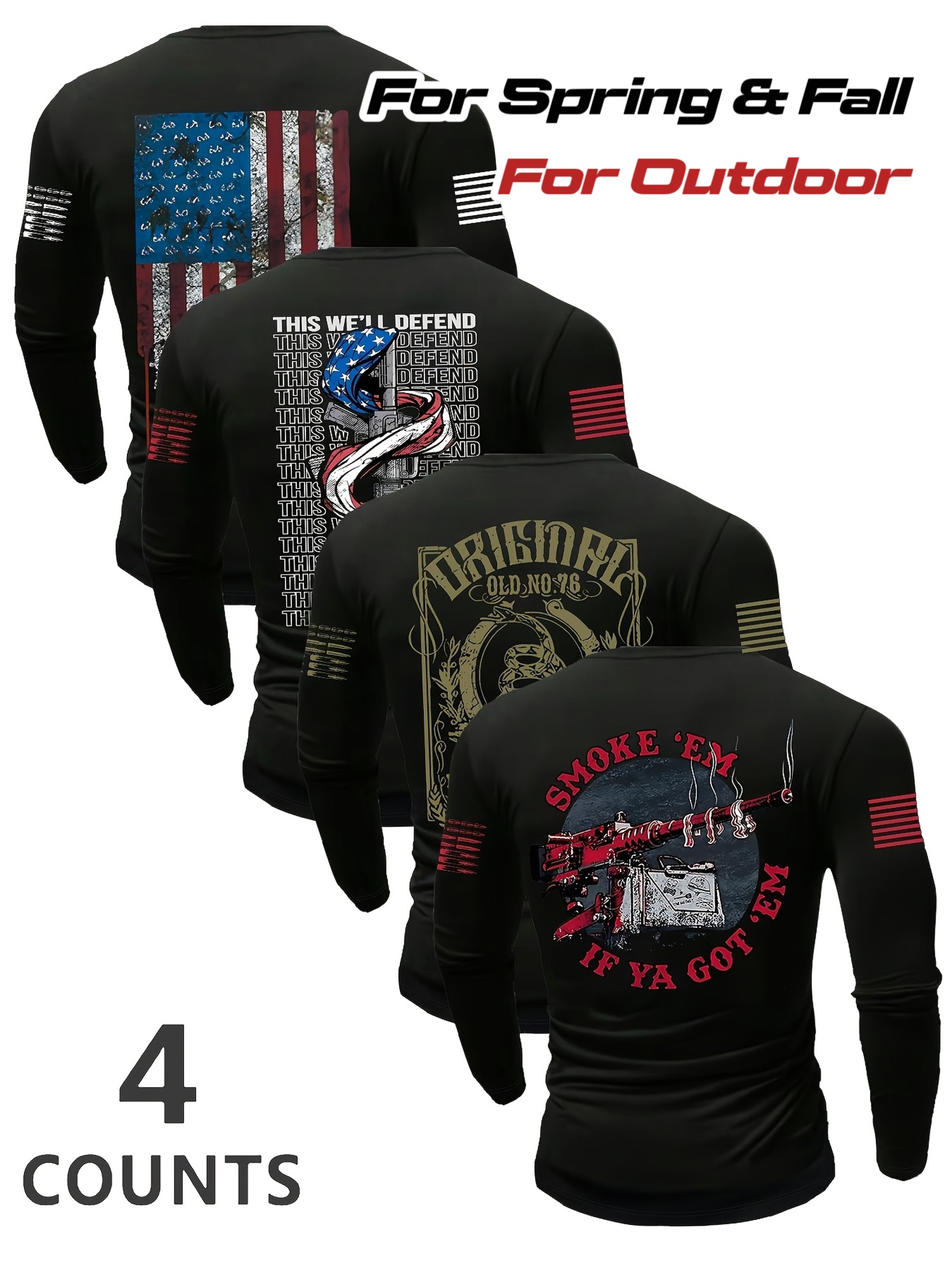 Home Men's T-Shirts Men’s Long-sleeved T-shirts 4PCS Letter Flag Pattern Printing Regular Spring and Autumn Long-sleeved T-shirts, Outdoor Sports and Leisure Long-sleeved Tops 4PCS SET