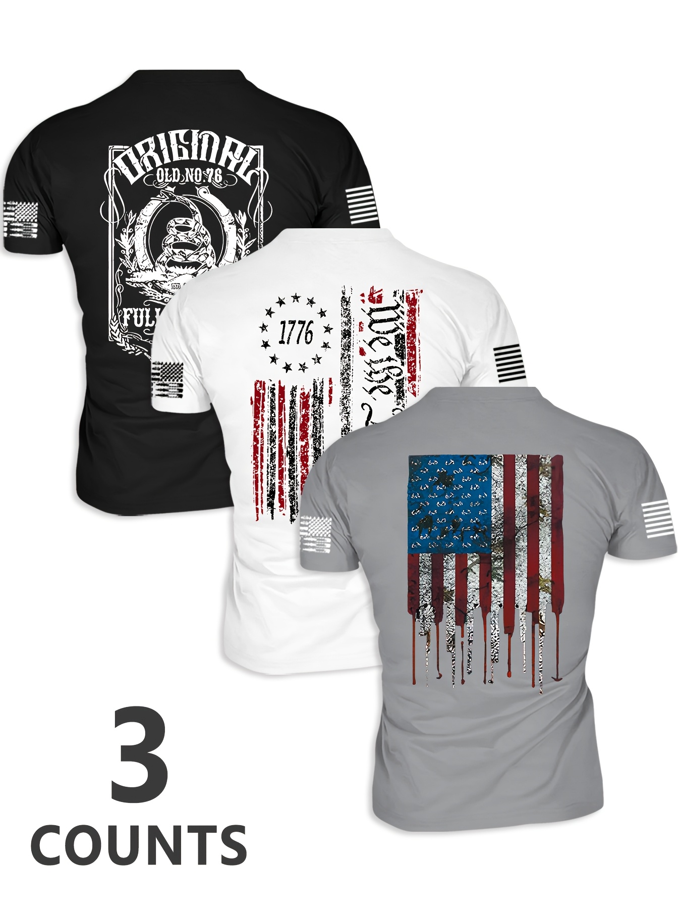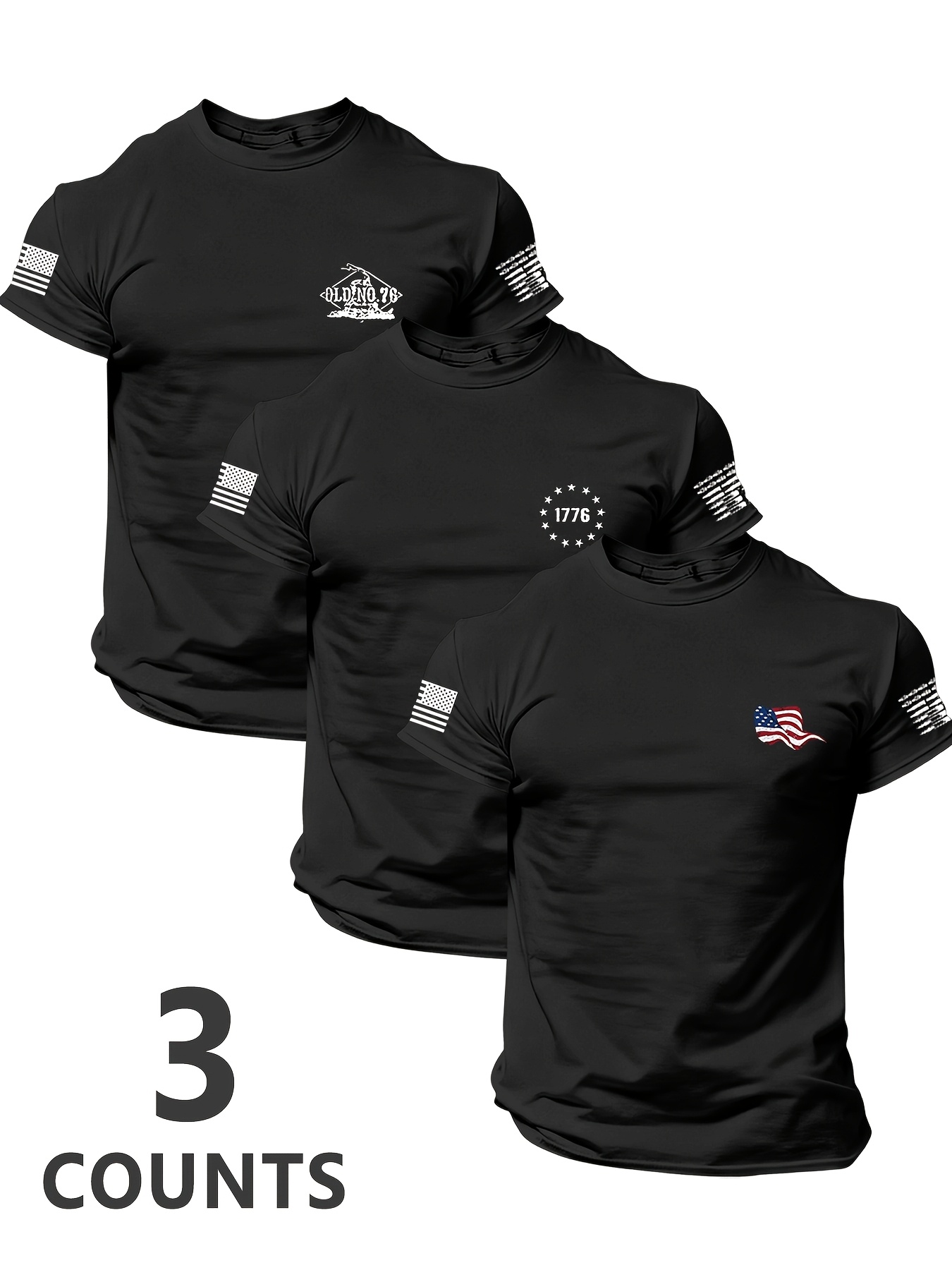 Set of 3 Men’S Long-Sleeve T-Shirts Featuring Letter And Flag Prints, Suitable for Regular Wear in Spring And Autumn, Perfect for Outdoor Sports And Casual Activities
