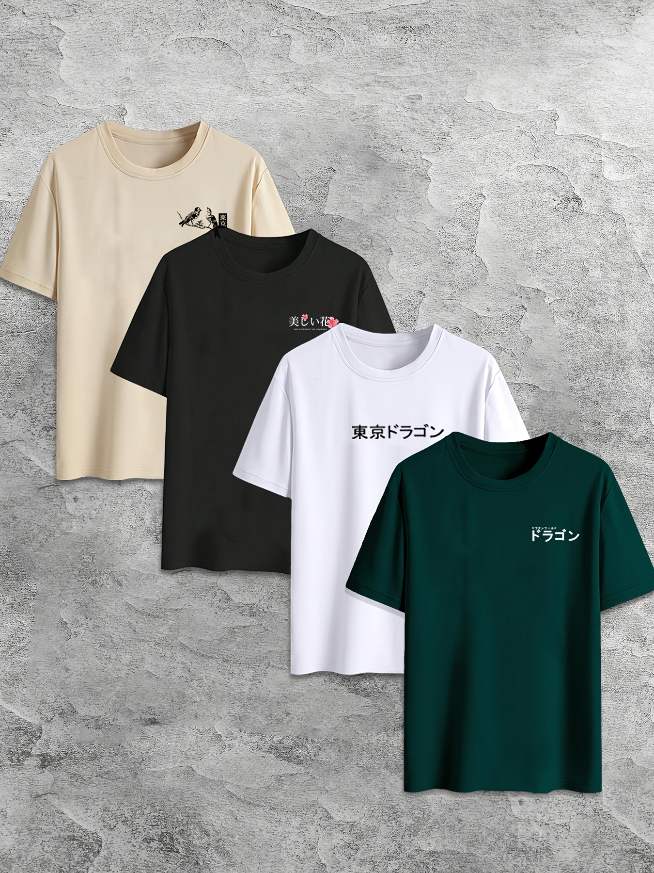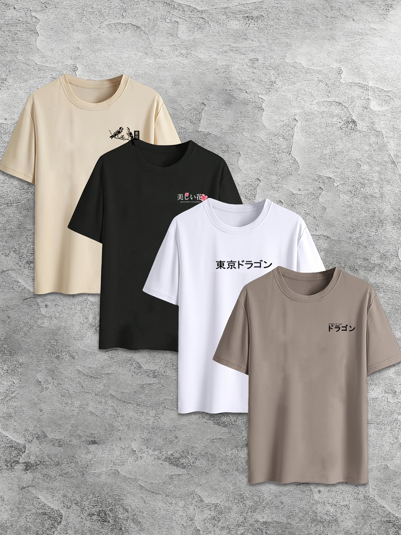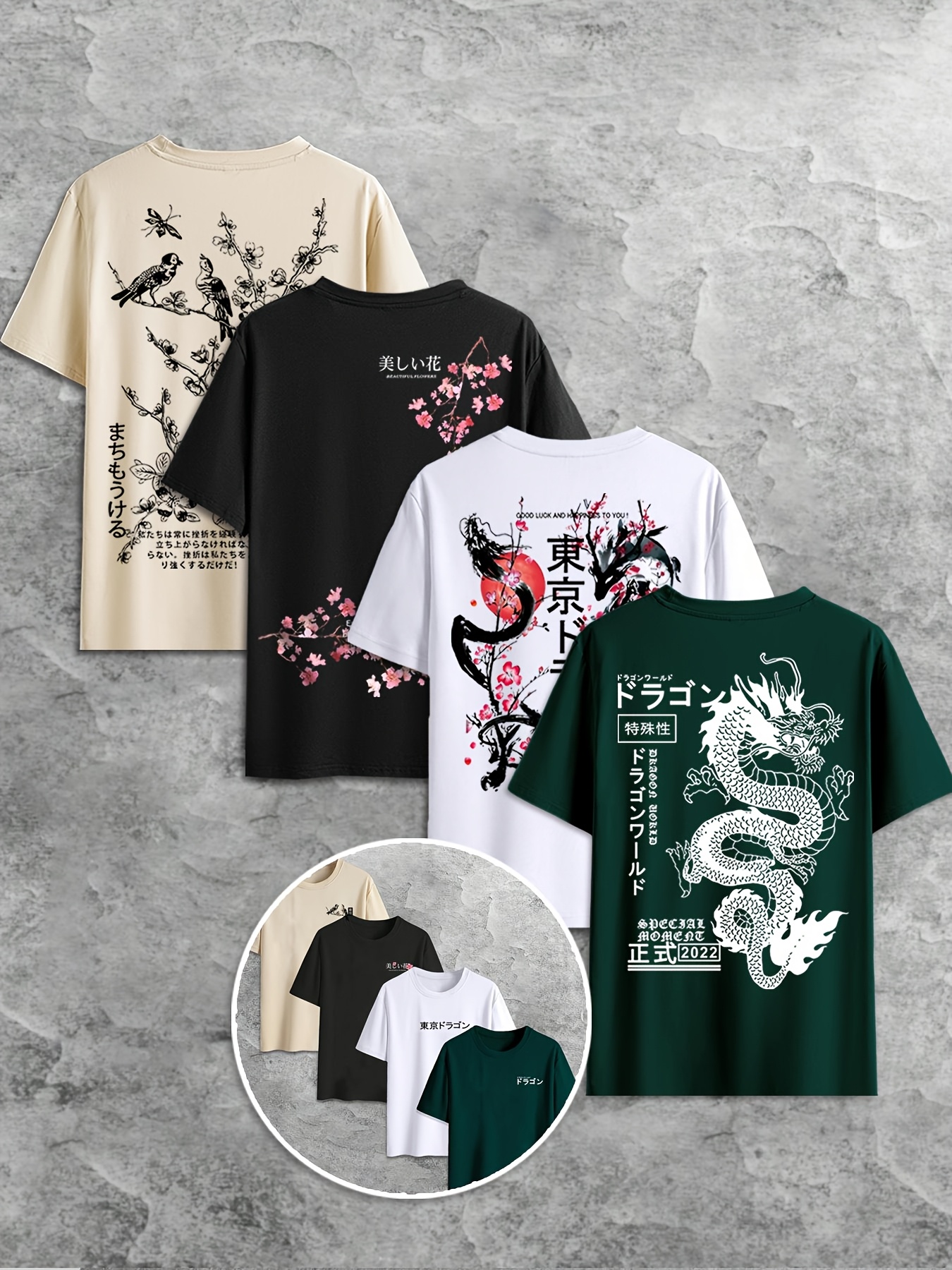 Men’s Short-sleeve T-shirt with Tokyo Dragon Japanese Print on the Collar, Suitable for Summer Outings, Casual and Versatile 4pcs Short-sleeve Set