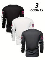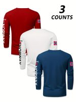 Set of 3 Men’S Long-Sleeve T-Shirts Featuring Letter And Flag Prints, Suitable for Regular Wear in Spring And Autumn, Perfect for Outdoor Sports And Casual Activities