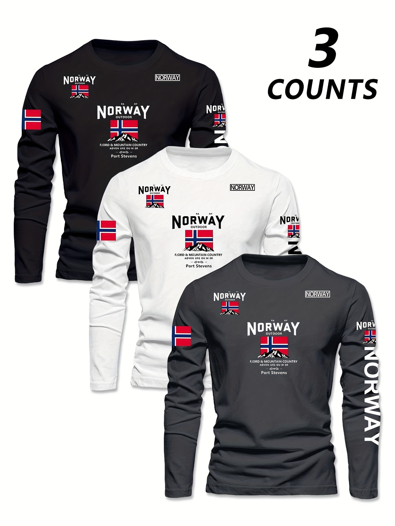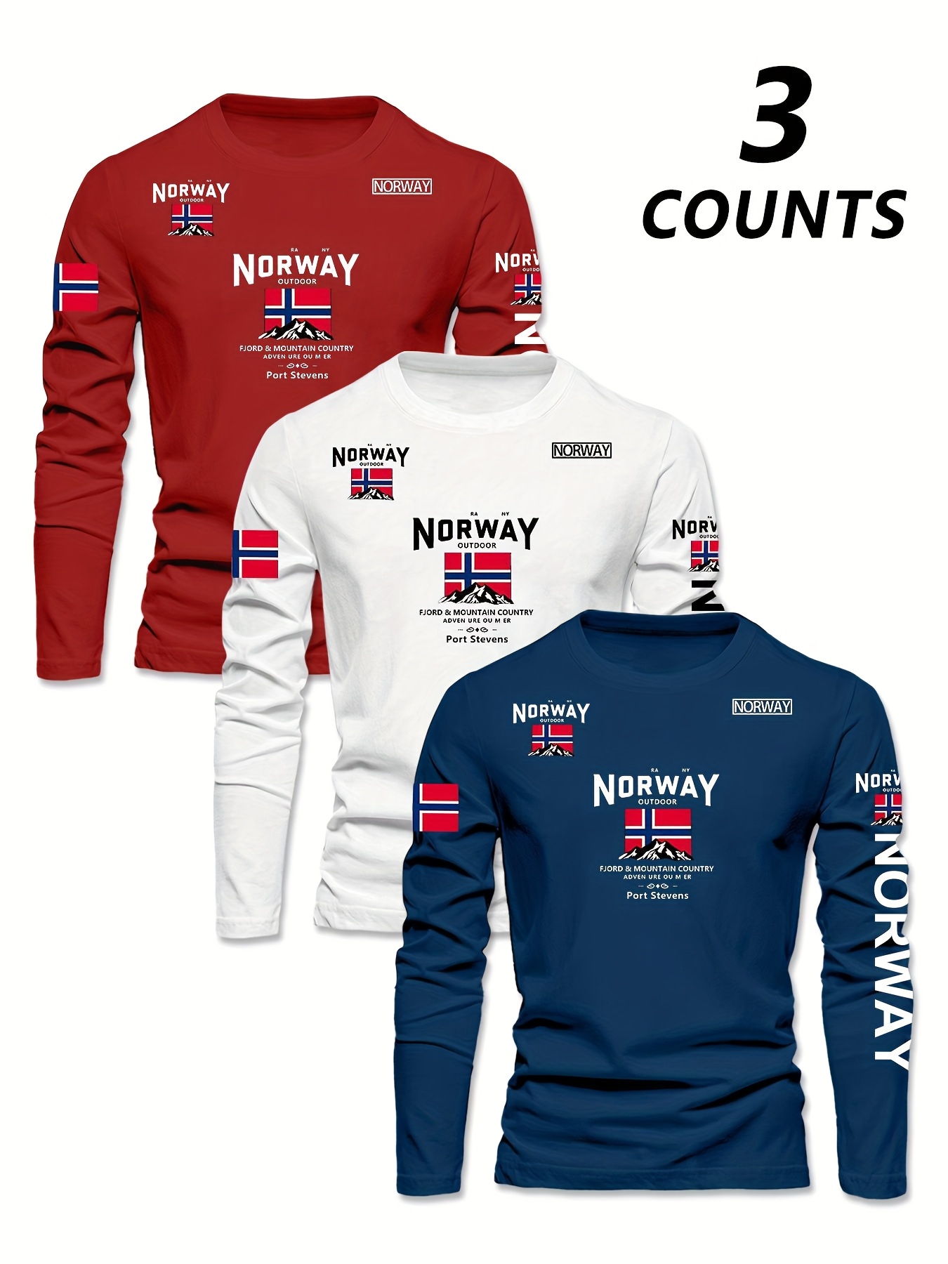 Home Men's T-Shirts Set of 3 Men’S Long-Sleeve T-Shirts Featuring Letter And Flag Prints, Suitable for Regular Wear in Spring And Autumn, Perfect for Outdoor Sports And Casual Activities
