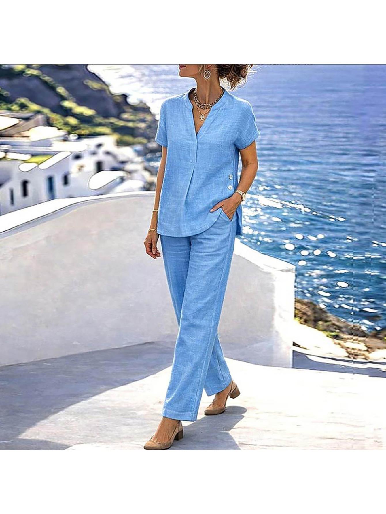 Home Women's Pants Women’S 2pcs Linen Sets, Sleeveless Top And Wide Leg Pants Lounge Outfits, Summer Vacation Travel Clothes, Fashion Matching Set