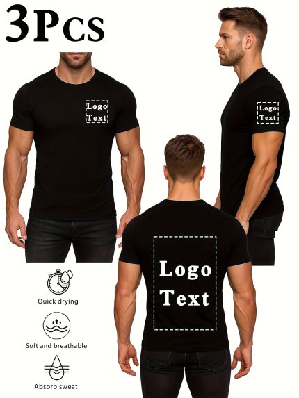 Custom 3pcs Men’s Quick-Dry Sports T-Shirts with Customizable Logou002FDesign on Chest and Back, Lightweight, Breathable, Moisture-Wicking, Cool and Comfortable, High-Efficiency Sweat-Wicking, Suitable for Running, Dancing, Swimming, and Various Sports